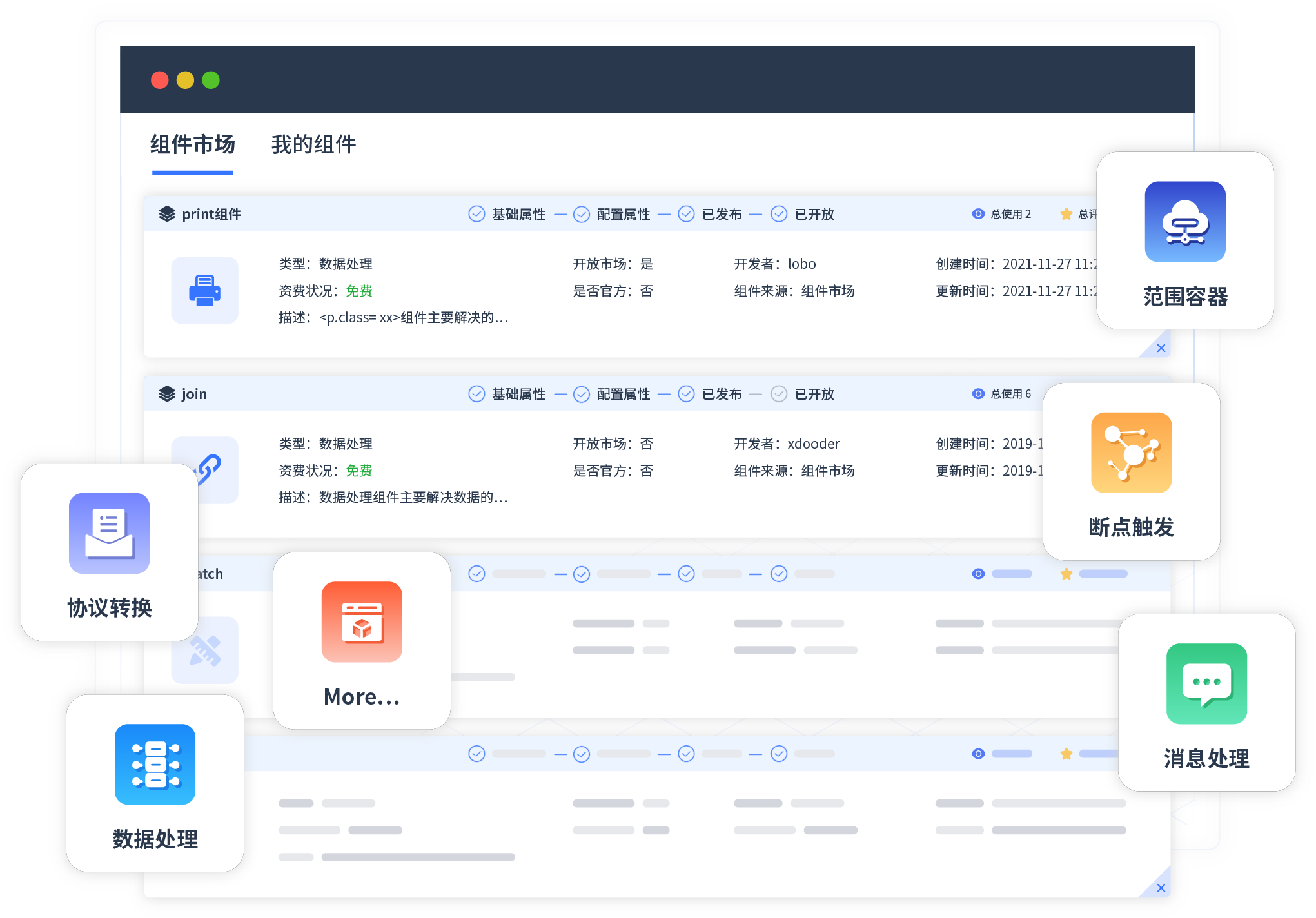 针对集成场景,,,TOPAY钱包提供组件市场,,,例如协议转换、、、消息处理、、、文件操作等。。。除平台提供的组件外,,,客户可以自定义所需组件。。。