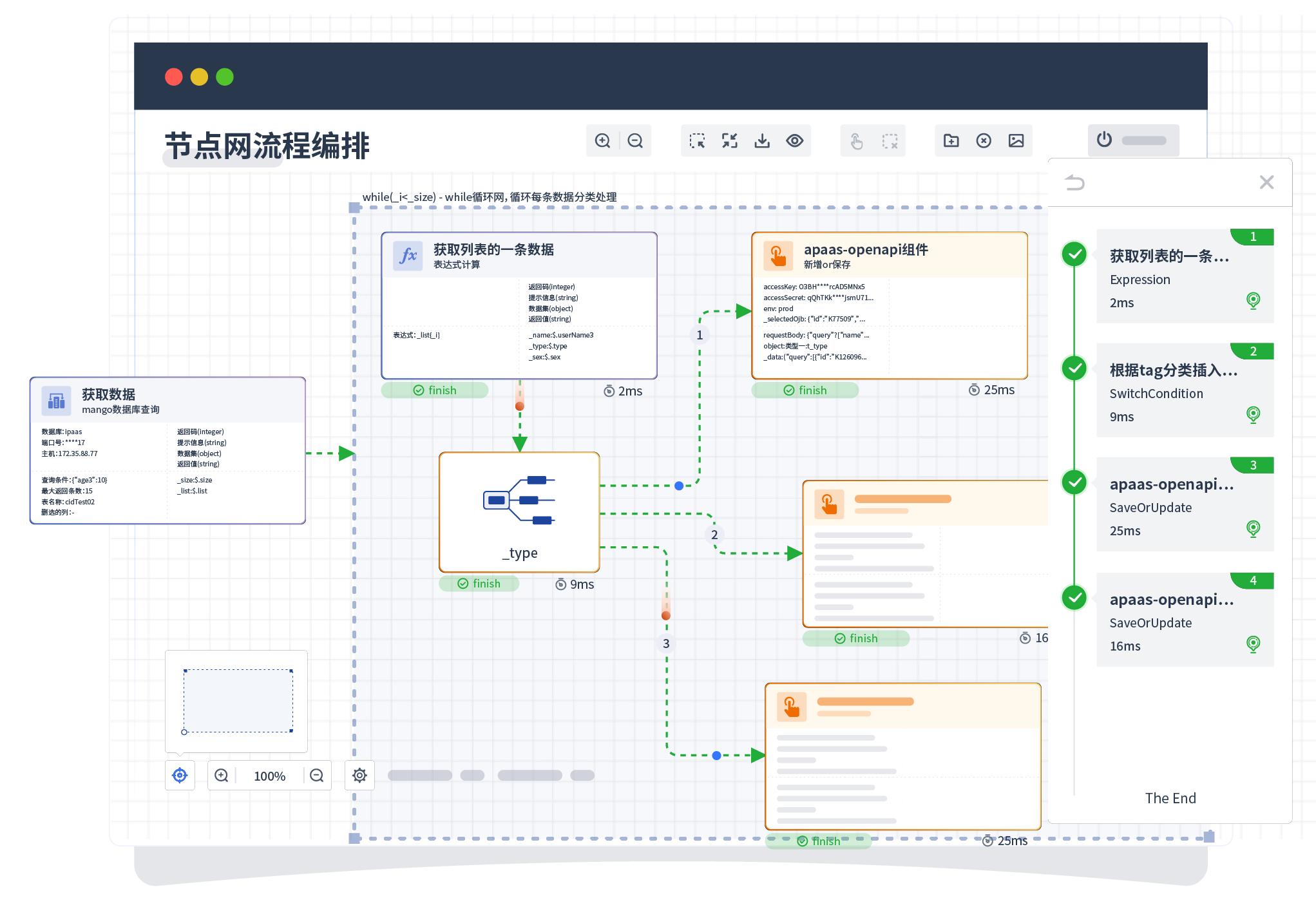 针对集成场景,,,组件定义后支持进行流程编制,,,不同于传统代码方式,,,通过图形化展示,,,支持在线调试、、、日志查看和运行回放。。。